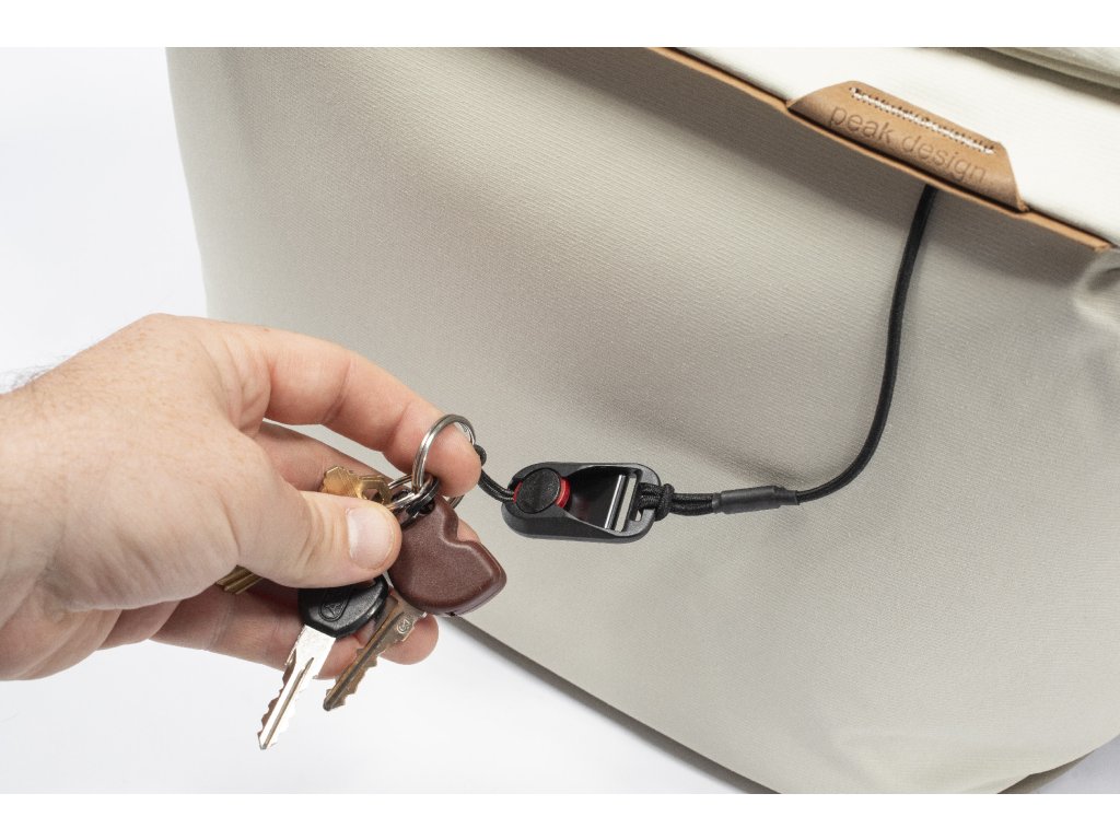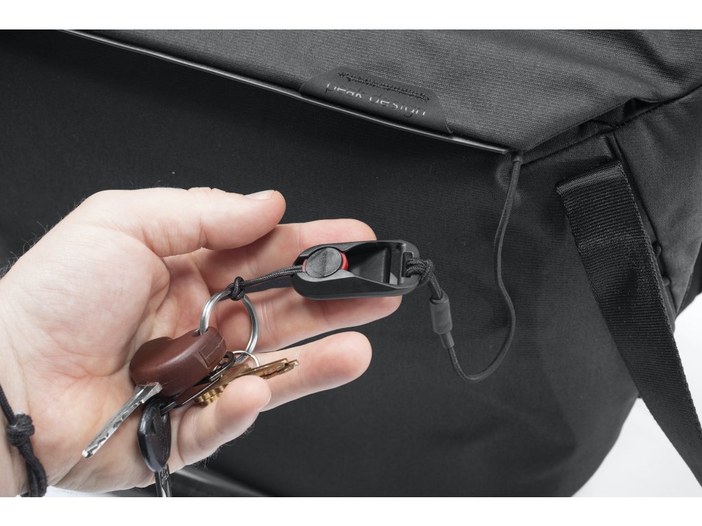 - Pojistka na klíče: Integrovaný úvazek s připojenou spojkou Peak Design Anchor Links, pro připojení kotviček Anchor a rychlému a bezpečnému připojení klíčů, vstupních pasů atd.