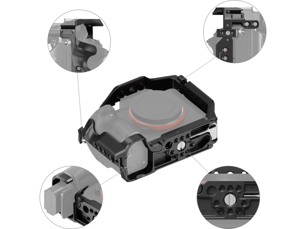 Klec SMALLRIG 2087 pro SONY A7III/A7RIIIVestavěné všestranné ochranné distanční prvky zabraňují poškrábání fotoaparátu.Klec umožňuje přístup k rozhraním, voličům, tlačítkům nebo bateriovým krytům.U prostoru pro baterii je výklopné rameno, které se přizpůsobí zakřivení fotoaparátu a ponechá prostor pro malé prsty pro pohodlné uchopení.Otvory se závitem 1/4"-20, polohovací otvory ARRI 3/8"-16 a úchyty pro studenou patku podporují horní rukojeť SmallRig 3765, boční rukojeť 3260, držák monitoru 2903, mikrofony, LED světla, monitory atd.Dolní zásuvka QD podporuje ramenní popruh QD.Rychloupínací destička Arca-Swiss ve spodní části je kompatibilní s DJI RS 2 / RSC 2 / RS 3 / RS 3 Pro, rychloupínací destičkou (riser plate) stabilizátorů DJI RS 2/RSC 2 pro natáčení se stabilizátorem a rychloupínací destičkou SmallRig Arca-Swiss 3154.Volitelná svorka kabelu SmallRig HDMI 3637 / 1679 pro ochranu rozhraní a zajištění stabilního přenosu signálu během natáčení.Otvory na bocích a dně klece umožňují připevnění příslušenství, například popruhu SmallRig na ruku 2456 a ramenního popruhu 2428.Kromě toho je klec vybavena vestavěným magnetickým klíčem, který usnadňuje demontáž a montážBalení obsahuje:1 x Klec Sony A7III/A7RIII 2087