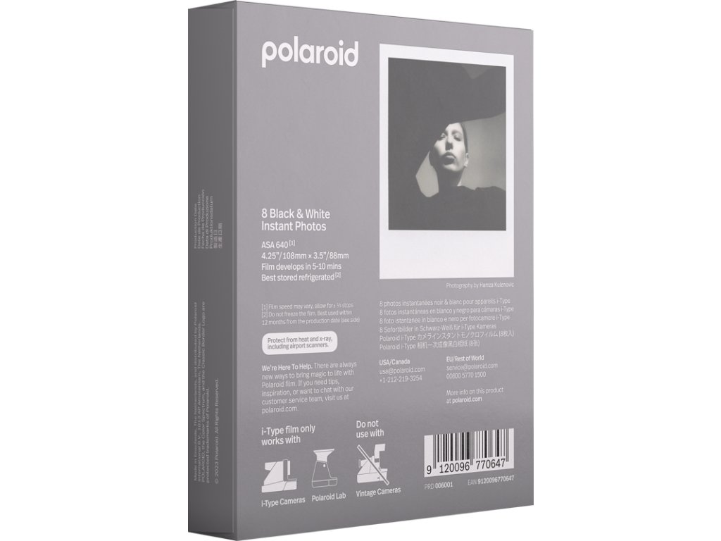 Osm instantních barevných fotografií s bílými rámečky. Pro použití pro fotoaparáty Polaroid i-Type. Fotografie se začne objevovat během 2 minut. Celý vývoj trvá asi 10-15 minut. Film i-Type je optimalizován pro kamery typu I. Je levnější než standardní film 600, protože neobsahuje baterie. Film i-Type využívá nejnovější černobílou chemii pro bezproblémové zachycení jemných detailů a vytváří vysoce kontrastní fotografie s hloubkou, atmosférou a výraznou analogovou strukturou. Ikonický styl bílého rámečku je dnes už legendární a připomíná nám, jak to celé všechno začalo.Doplňkové parametry
