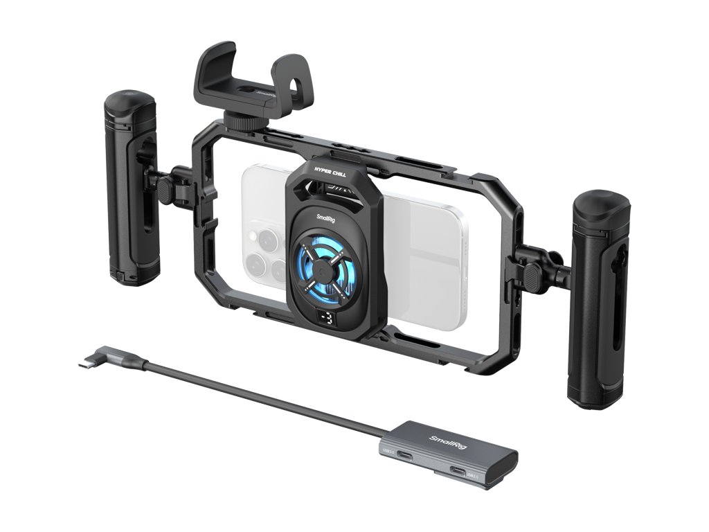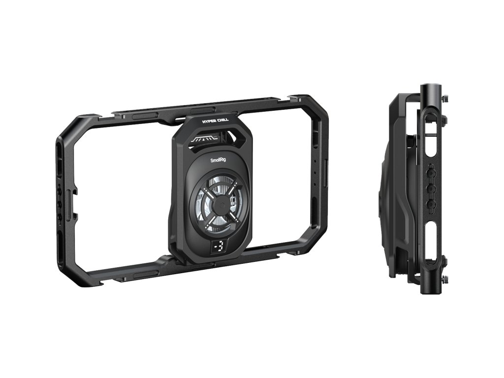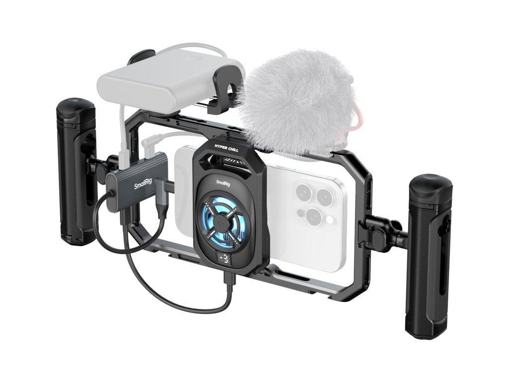 SmallRig 5276 All-in-One Thermal Dual-handheld Video Kit pro mobilní telefon Klec na telefon je vybavena výkonným 15W chladicím systémem se třemi úrovněmi chlazení, který účinně zabraňuje přehřátí zařízení a eliminuje problémy, jako jsou výpadky obrazovky a neočekávané vypínání při delším natáčení. Dvě otočné boční rukojeti zvyšují stabilitu a umožňují flexibilní nastavení úhlu pro pohodlné mobilní natáčení. Všestranný rozbočovač 4 v 1 USB-C kombinuje nabíjení, vstup pro mikrofon, monitorování zvuku a přenos videa 4K na externí disky SSD. Svorka navíc bezpečně drží vaše powerbanky a zajišťuje spolehlivé napájení pro nepřerušovaný provoz.  Kompatibilita:Kompatibilní se smartphony o šířce 64-79 mm. (Pro optimální výkon používejte bez pouzdra na telefon)Balení obsahuje:Univerzální chladicí klec na telefonRychloupínací otočná rukojeť s bezdrátovým ovládánímRychloupínací boční rukojeťRozbočovač USB-C 4 v 1Držák powerbankyUživatelská příručkaSystémové specifikace:Připojení: Port USB-CVstupní napětí: 5 VVstupní proud: 3A (max.)Pracovní výkon:3 úrovně:14W (vysoký)12.5W (střední)11W (nízký)Podpora nabíjení: QC / PD: 20W / 30W / 45W / 60W / 67W / 120WSpecifikace bezdrátového ovládání:Provozní výkon: 15mWPočáteční výkon: 0.006mWTyp baterie & Kapacita: CR2032 225mAhNapětí: 3VProud: 0.2AProvozní teplota: -30 ℃ až 60 ℃Rozsah bezdrátového ovládání: 10m Frekvence bezdrátového ovládání: 2,4G HzBezdrátové ovládání: 2,4G HzDoplňkové parametry