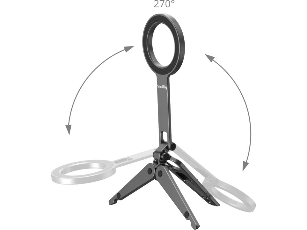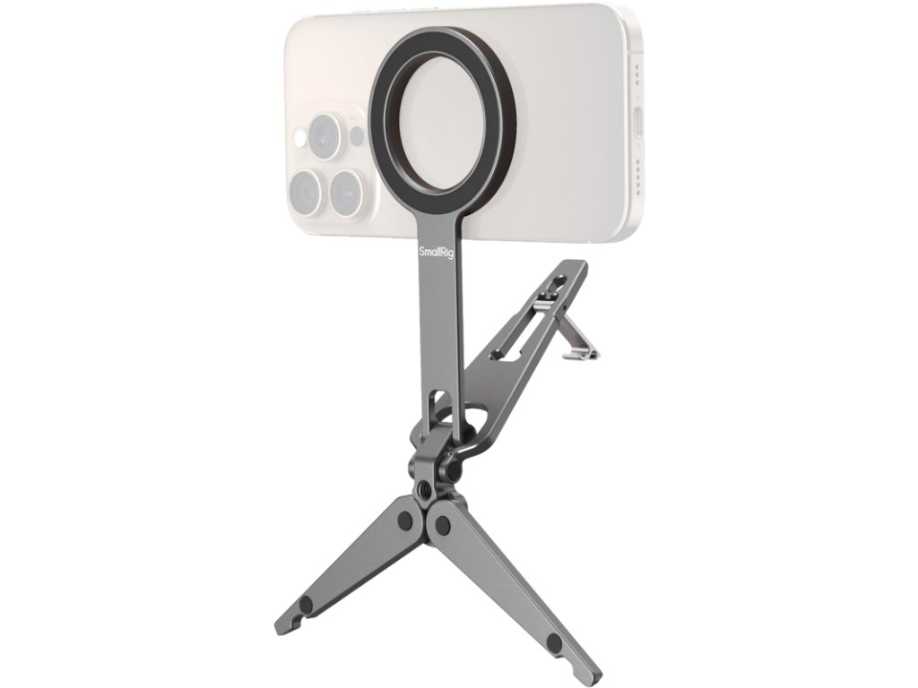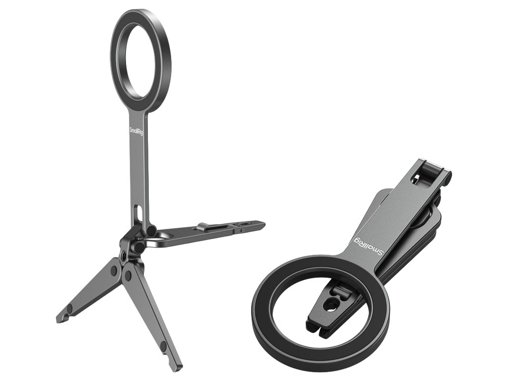SmallRig 5649 s podporou mobilních telefonůKompatibilní s modely iPhone 12-17 podporujícími MagSafe, obsahuje také adaptér s magnetickým kroužkem pro zařízení bez MagSafe. Stativová základna je vybavena protiskluzovými silikonovými podložkami pro stabilní umístění a integrovaný hákový držák umožňuje bezpečné upevnění na povrchy, jako jsou obrazovky počítačů (až do tloušťky 4 mm) nebo ploty z drátěného pletiva na straně hřiště pro stabilní záznam. Skládací konstrukce zajišťuje kompaktní tvar při skladování, takže je lehká a vysoce přenosná.Poznámka:Max nosnost: 300gMax podpěrná výška (vertikální): Maximální tloušťka háku: 16 cmMax: Vyvarujte se připevnění na kreditní karty, pasy, naslouchátka atd., protože by mohlo dojít k jejich demagnetizaci. Mějte je prosím odděleně.Balení obsahuje:Telefonní podporaKovový kroužek.Doplňkové parametry