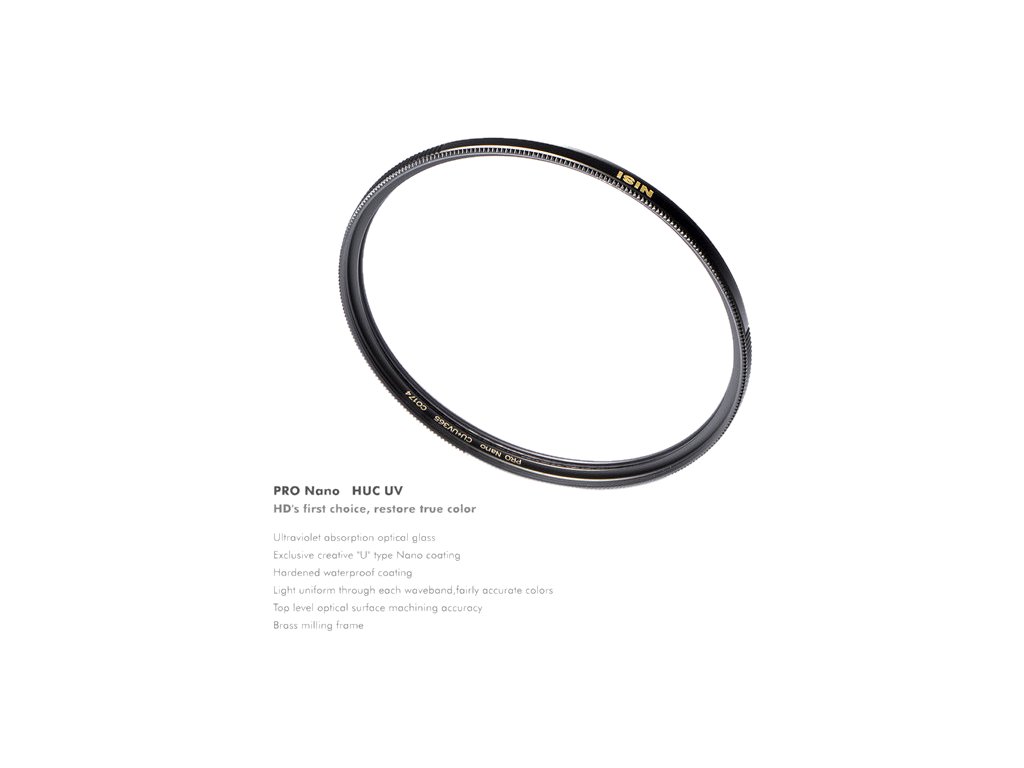 Ultratenké filtry NiSi PRO Nano HUC UV používají oboustrannou vícevrstvou optickou technologii, která využívá vysoce kvalitního japonského optického skla pohlcujícího ultrafialové světlo. Zajišťuje tak vysokou propustnost a vysoce hladký povrch, který zabraňuje nechtěným odrazům. Rámeček je vyrobený z mosazi pomocí vysoce přesného mosazného obrábění a má tloušťku pouhých 3,5 mm, což znamená, že tento ultratenký filtr výborně padne i na extrémně širokoúhlé objektivy a zabraňuje tak vinětaci. NiSi PRO Nano HUC UV disponuje exkluzivním kreativním nano povlakem typu „U“ a tvrzenou vodotěsnou vrstvou.UV filtr je vhodný také jako obecný ochranný filtr, který může zůstat trvale přidělaný na objektivu. Filtry pomáhají snížit množství prachu a vlhkosti v kontaktu s vaším objektivem a poskytuje také dodatečnou ochranu proti pádům nebo možnému poškrábání.Optické sklo pohlcující ultrafialové světloMosazný rámeček je vyrobený metodou vysoce přesného mosazného obrábění.Exkluzivní kreativní nano povlak typu „U“.Tvrzený vodotěsný povlak.Nejvyšší úroveň přesnosti broušení optického povrchu.Ultratenký (3,5 mm): Minimalizuje efekt vinětace na širokoúhlých objektivechVysoce kvalitní optické sklo pro vysokou propustnost (>99,2%) a vysoce hladký povrch s nízkým odrazem pouze 0,3%Chrání objektiv před prachem či poškozením předního prvkuJednoduché čištěníDoplňkové parametry